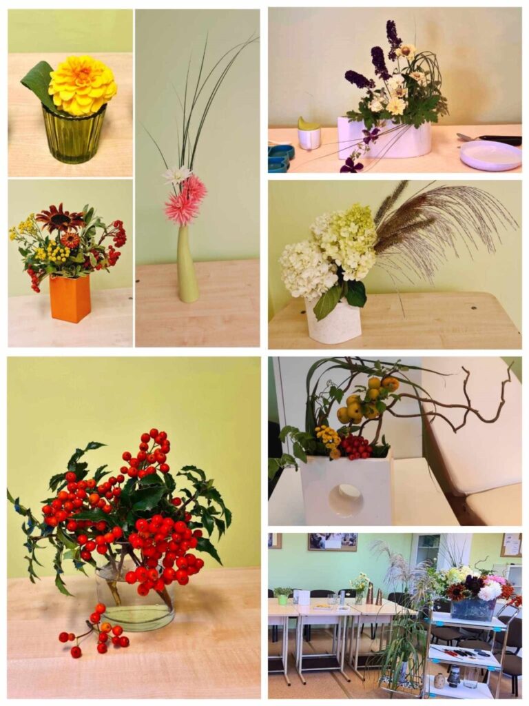 Praktinėje edukacijos dalyje kiekviena mokinė, derindama indą bei augalus, sukūrė ir pristatė nesudėtingą gėlių kompoziciją, skirtą konkrečiai vietai.