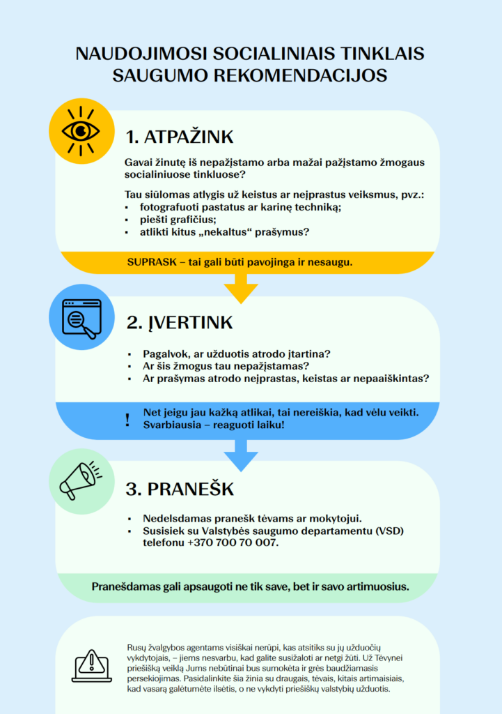 Jeigu vaikai, paaugliai Lietuvoje socialiniuose tinkluose gautų nepažįstamų ar mažai pažįstamų žmonių pasiūlymų už atlygį nufotografuoti pastatus, nupiešti grafičių ar atlikti kad ir visiškai iš pirmo žvilgsnio atrodytų nekaltus darbus, jie nedelsdami apie tai turėtų pranešti savo tėvams ir perduoti informaciją Valstybės saugumo departamentui (VSD) telefonu +370 700 70 007.