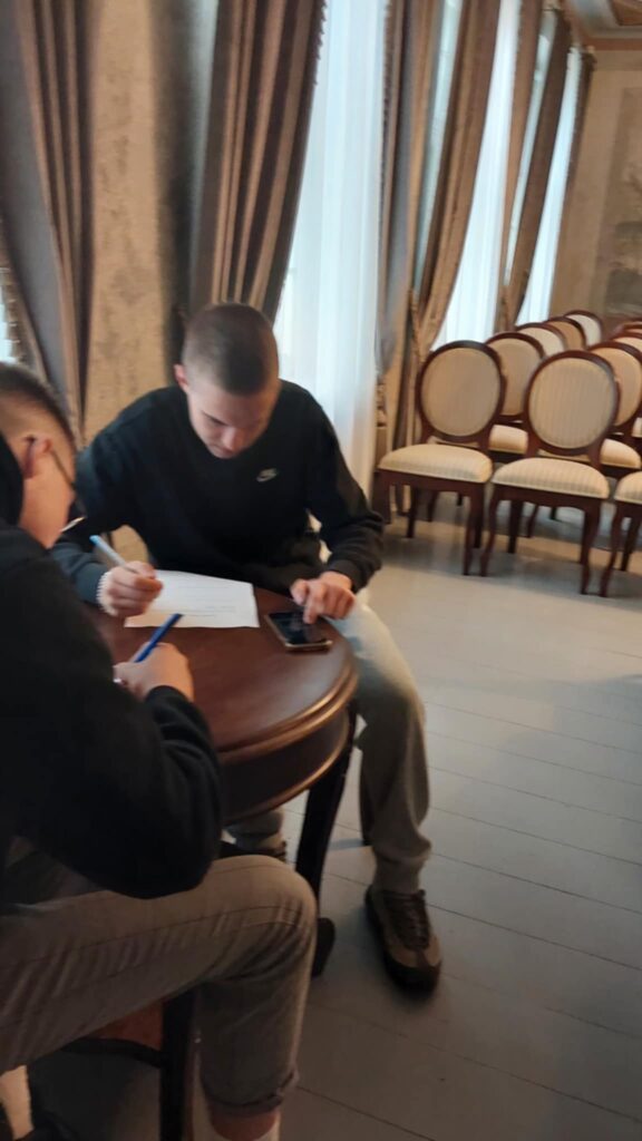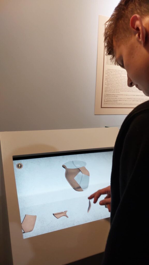 Prieš pradėdami savarankišką darbą, mokiniai išgirdo muziejaus gido Domanto pasakojimą apie archeologinius radinius abiem kalbomis. Ši integruota lietuvių ir anglų kalbų pamoka leido mokiniams ne tik gilinti kalbinius įgūdžius, bet ir pažinti muziejaus ekspozicijas iš arčiau.